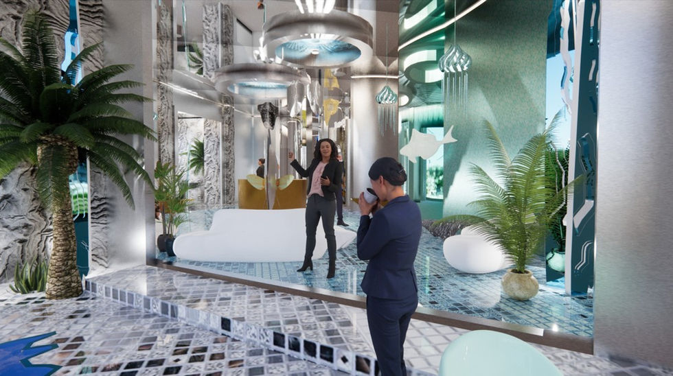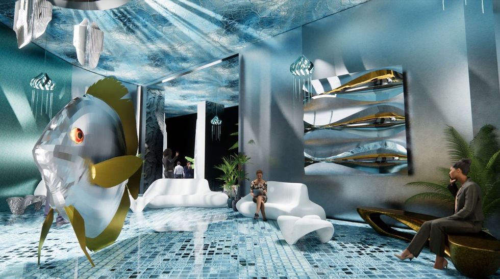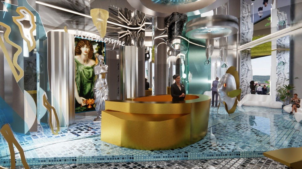 Oversized sculptures of Greek gods and goddesses are carefully positioned as a reference to ‘'Mnemosyne', the Greek goddess of memory. A giant gold and silver statue of an Angel fish provokes an immersive underwater experience.