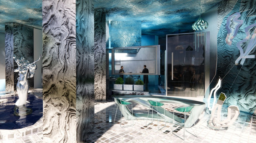 Create an interior design proposal for the ground floor foyer of the apartment complex, as well as a front-of-house bar and lounge discreetly connected to the foyer. Both the proposed foyer, bar and lounge should significantly enhance the ‘living experience’ within the residential complex.