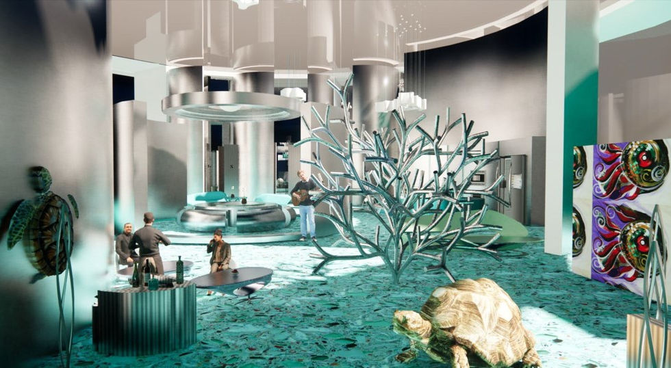 The flooring throughout is a crushed oyster shell material, and the furniture in the living areas consists of recycled plastic. The rugs and carpets in various locations are also a recycled plastic material. Furniture and walls of sheet metal are made from recycled crushed aluminum cans.