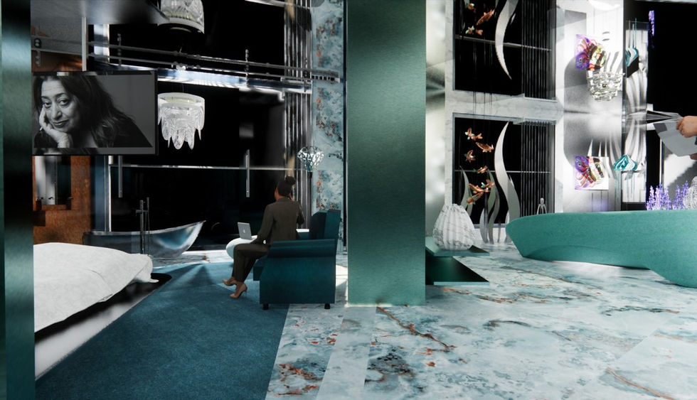 The ceilings in both apartments can be transformed by the flick of a master switch at each entrance. From shiny mirrored ceilings they magically become a myriad of swimming silver fish. Some lighting and furniture is from the Zaha Hadid range to enhance the Décor.